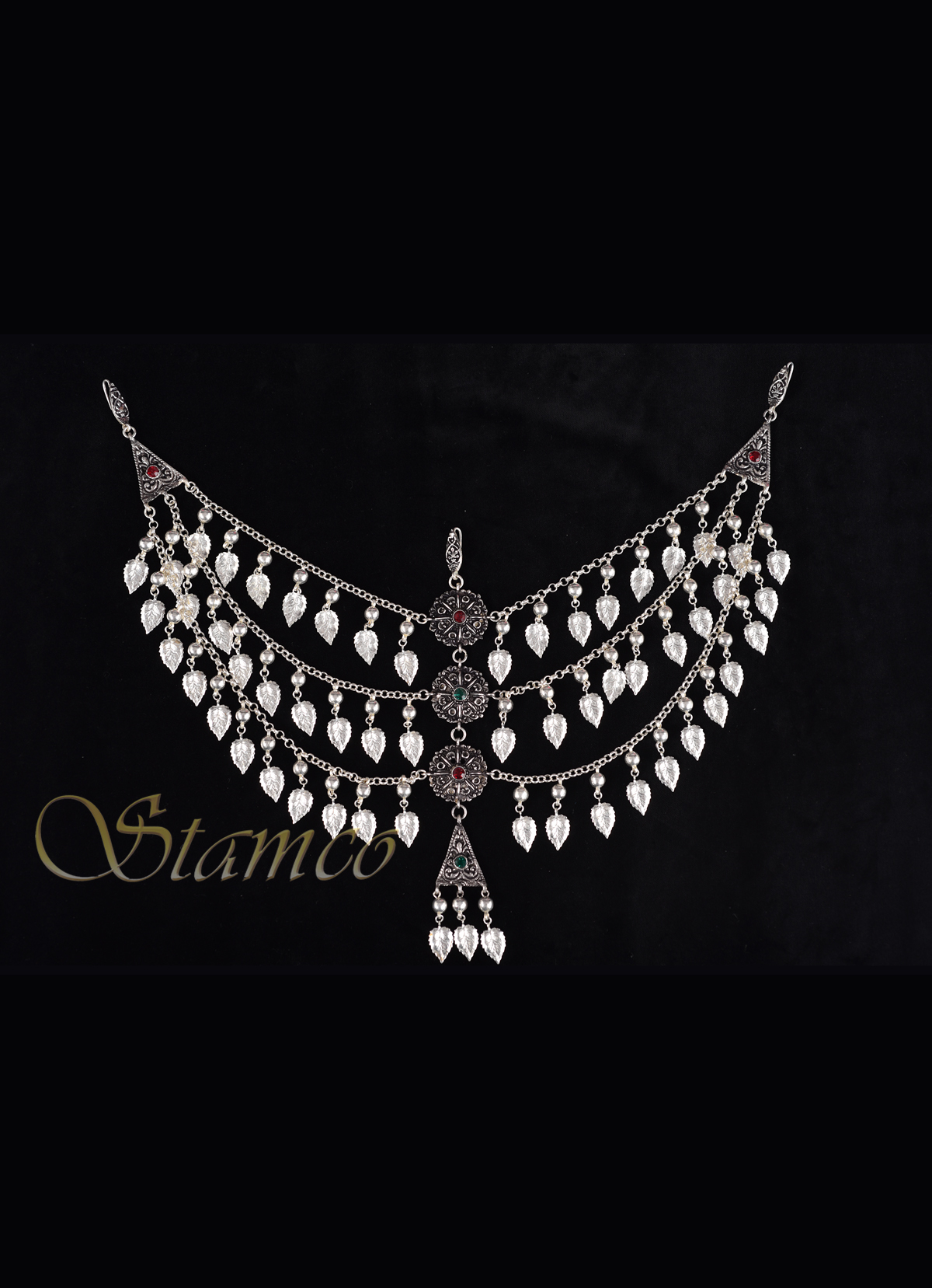 Ένα πολύ όμορφο κόσμημα στήθους που αποτελείται από τρεις σειρές φλουριά (φυλλαράκια) και ανάγλυφα σχέδια σε στρόγγυλο και τρίγωνο σχήμα. Είναι στολισμένο με πράσινες και κόκκινες πέτρες ενώ διαθέτει δύο γαντζάκια στις άκρες του κοσμήματος και ένα στο κέντρο για να στερεώνεται καλύτερα πάνω στην φορεσιά. Ένα ιδανικό κόσμημα για τις γυναικείες ποντιακές αλλά και παιδικές φορεσιές.