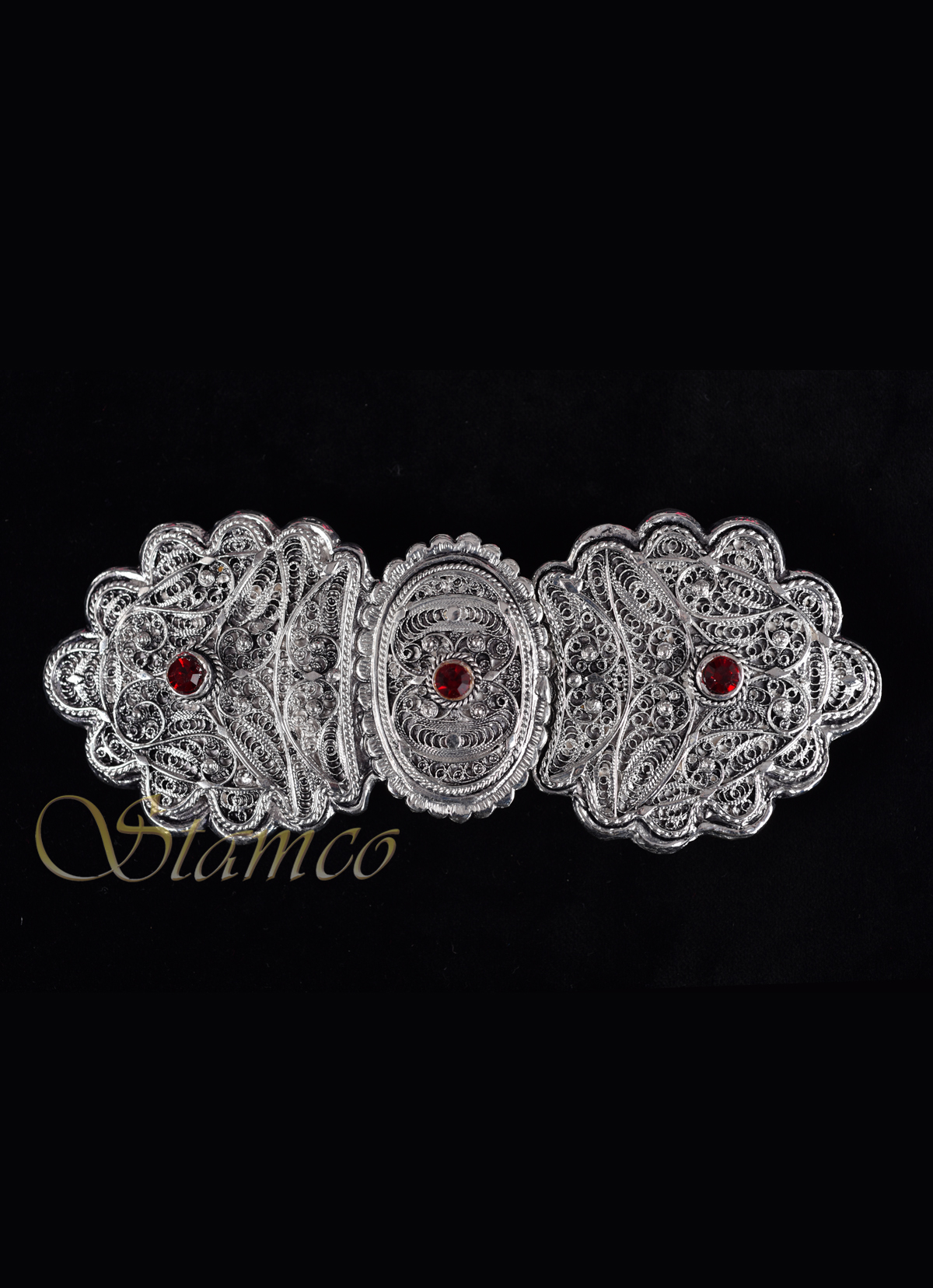 Η πόρπη είναι διακοσμημένη με 3 κόκκινες πέτρες και διαθέτει γαντζάκια εσωτερικά για να στερεώνεται καλύτερα πάνω στην φορεσιά.
