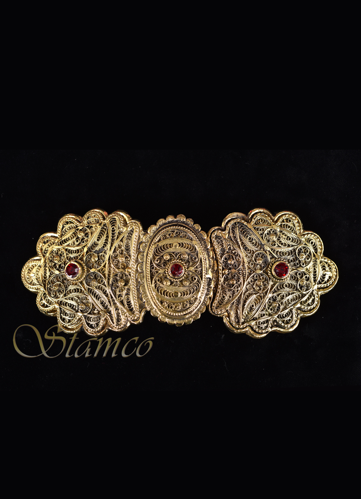 Η πόρπη είναι διακοσμημένη με 3 κόκκινες πέτρες και διαθέτει γαντζάκια εσωτερικά για να στερεώνεται καλύτερα πάνω στην φορεσιά.