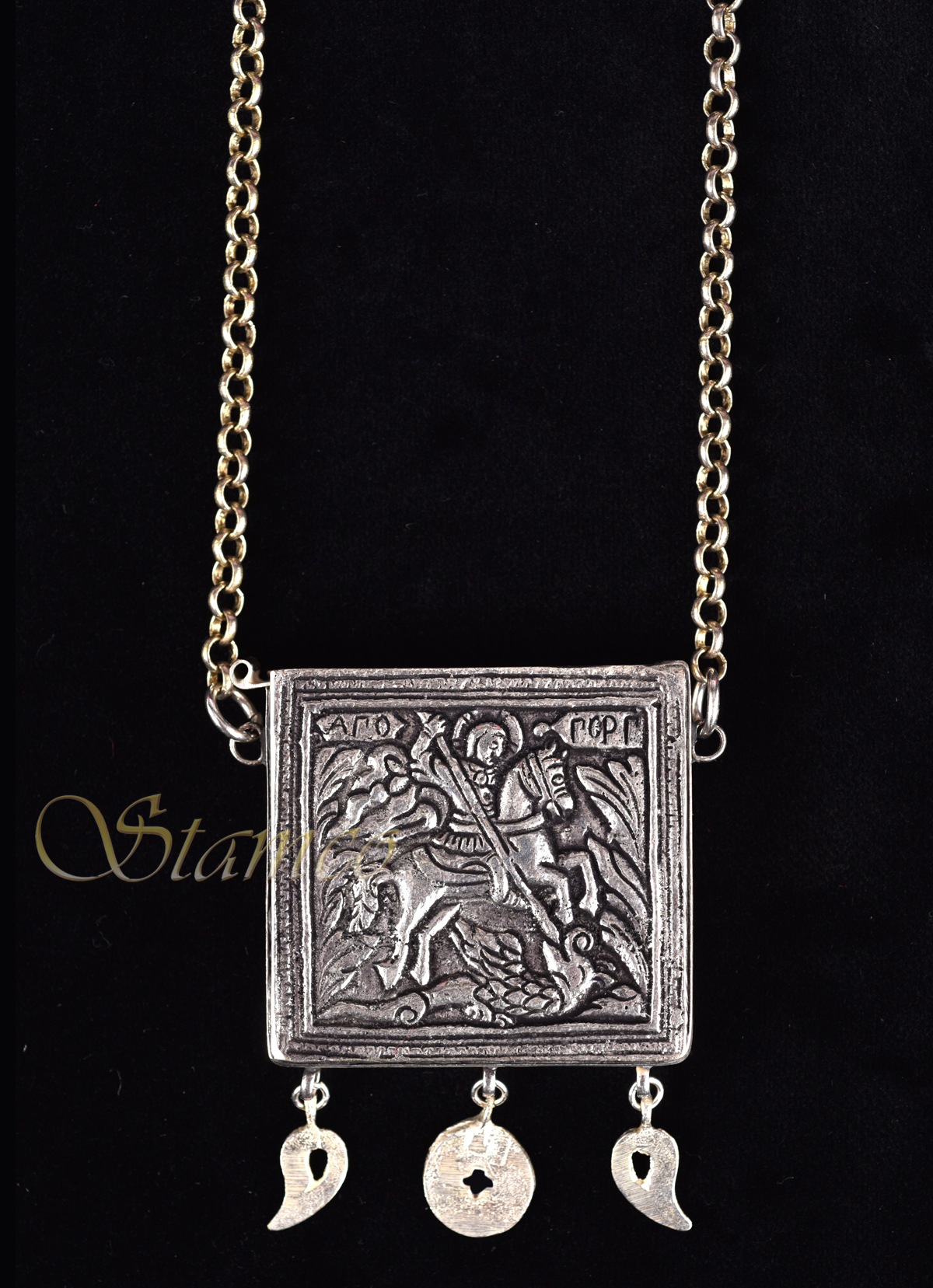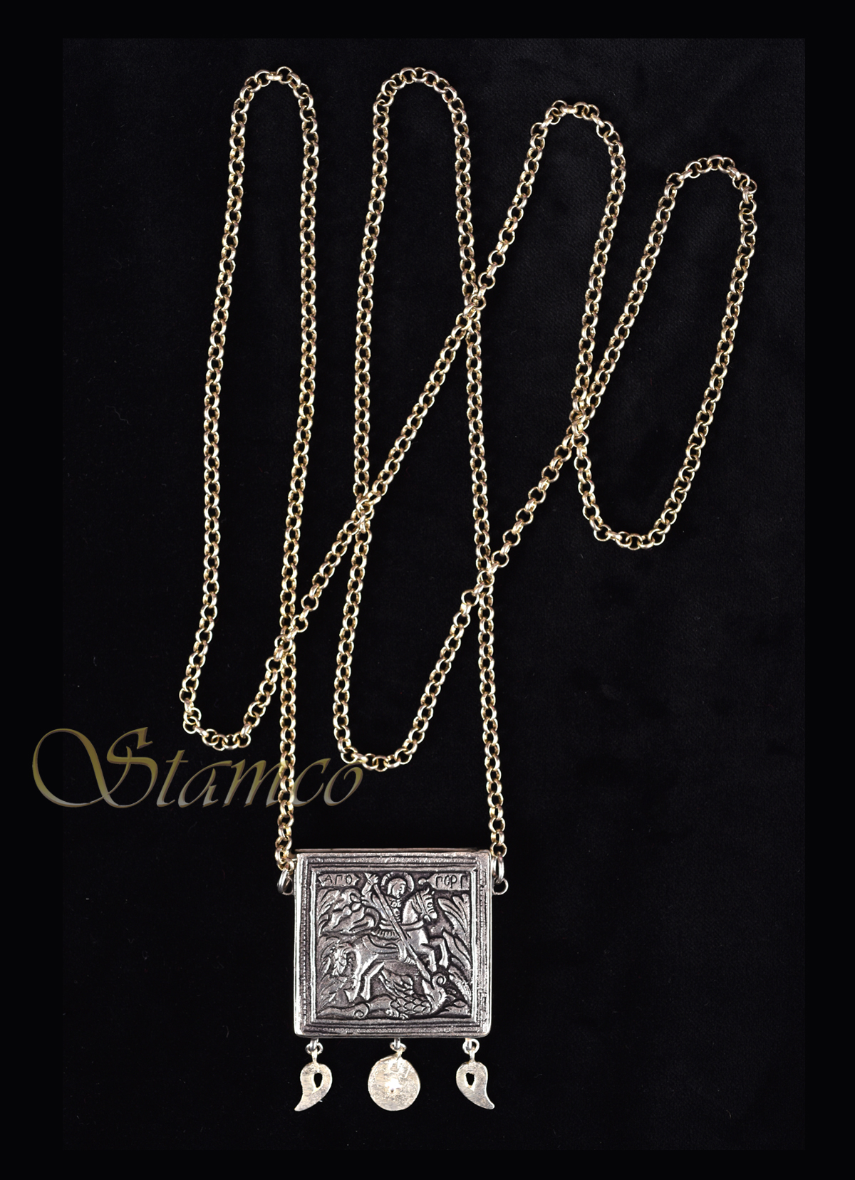 Ένα πολύ όμορφο ασημένιο κόσμημα σε τετράγωνο σχήμα που έχει χαραγμένο τον Άγιο Γεώργιο. Έχει μακριά αλυσίδα και στο τελείωμα του 3 ασημένια κρεμαστά σχέδια.