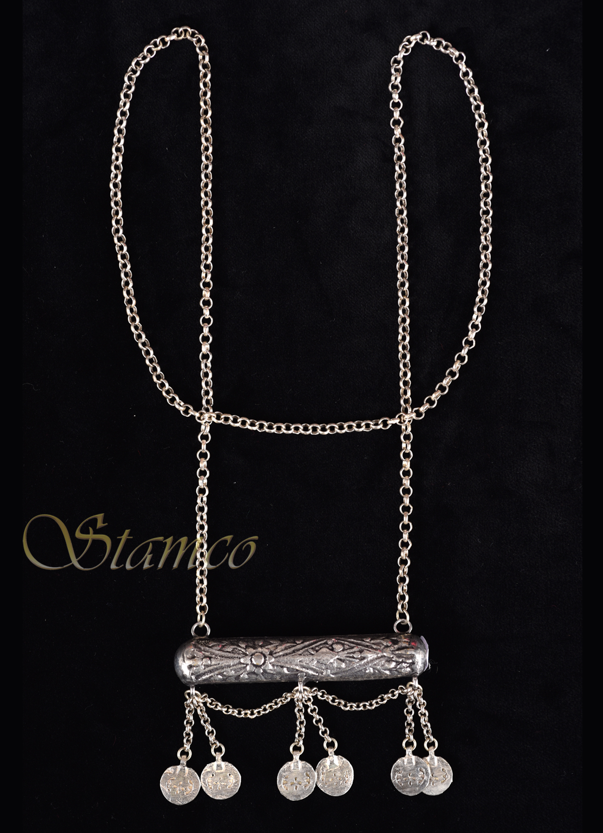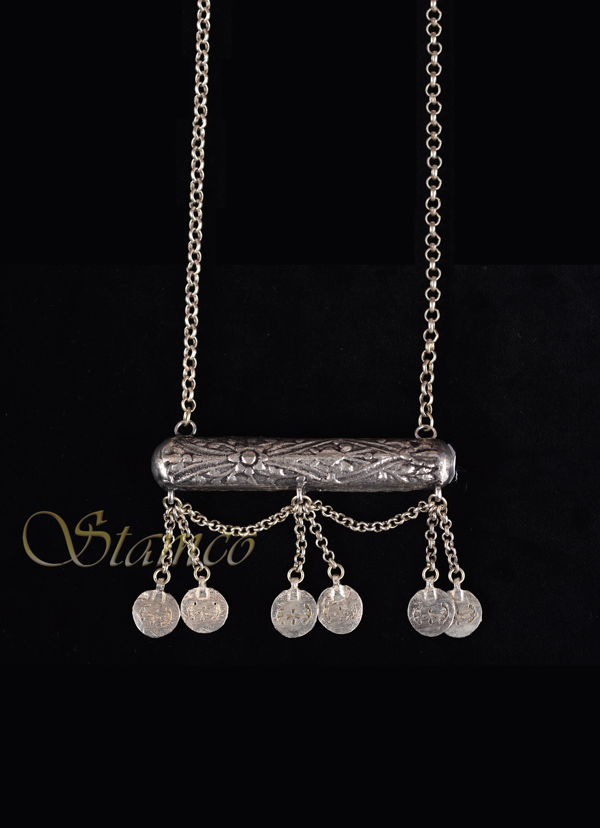 Ένα πολύ όμορφο ασημένιο κόσμημα σε παραλληλόγραμμο σχήμα. Έχει σκαλισμένα σχέδια με λουλούδια, μακριά αλυσίδα και στο τελείωμα του 6 ασημένια φλουριά πιασμένα σε δυάδες.
