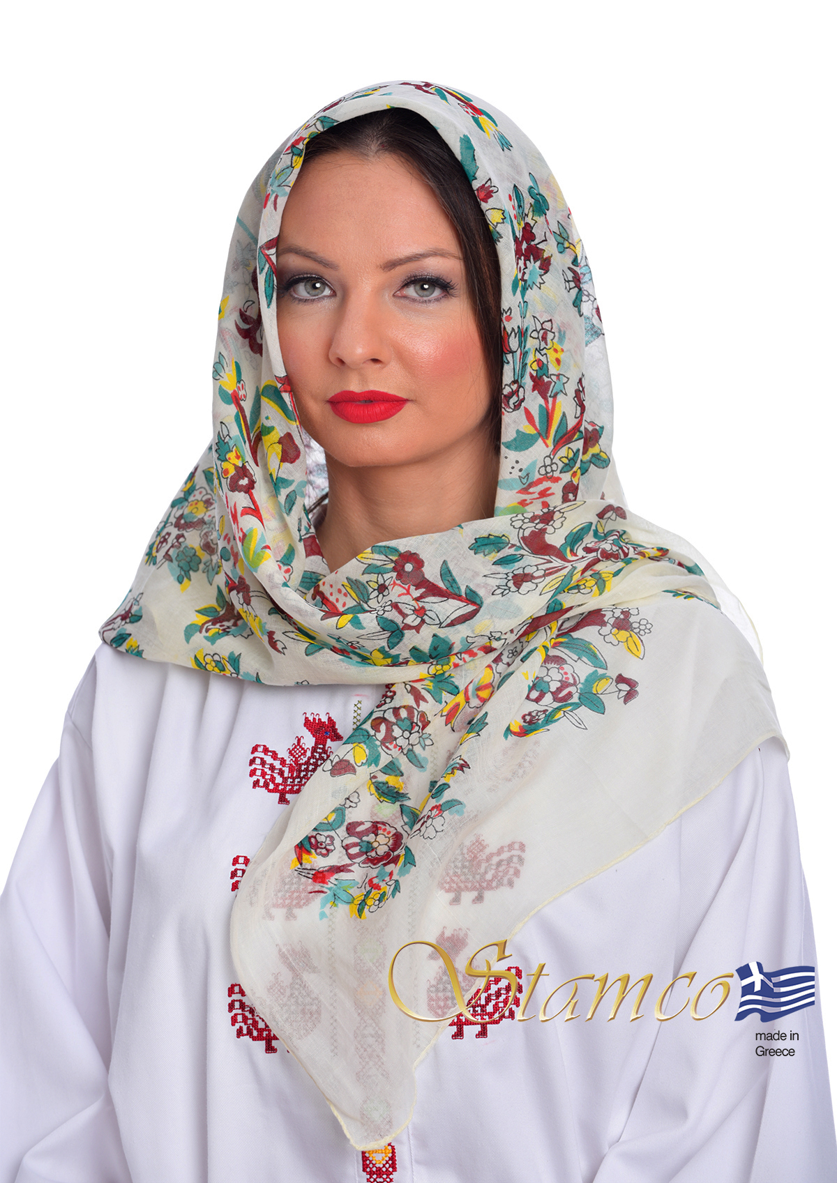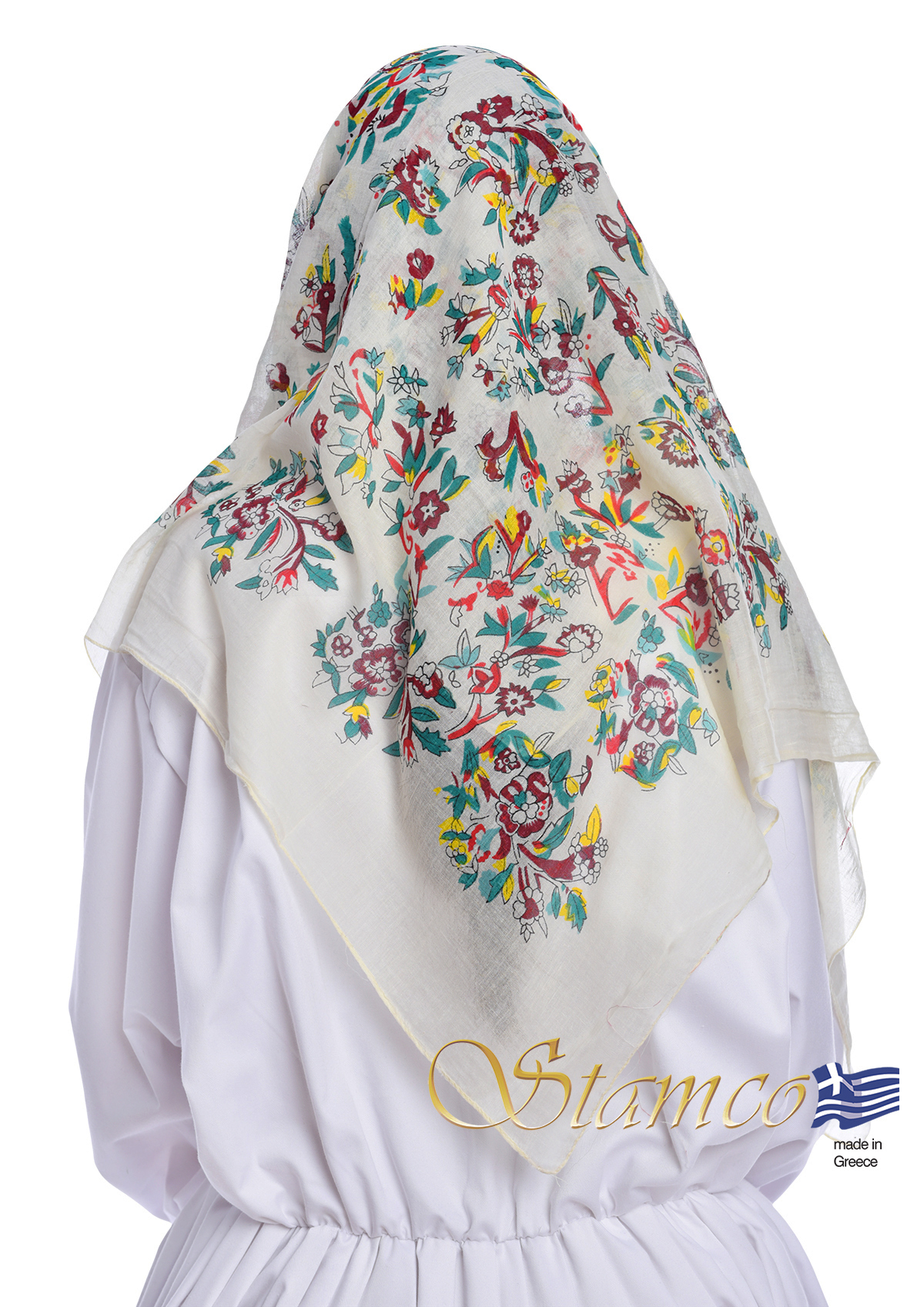 Παραδοσιακό Μαντήλι άσπρο βαμβακερό με τυπωμένα πολύχρωμα λουλούδια από την Αττική. Ένα ιδανικό αξεσουάρ για όλες τις γυναικείες και παιδικές παραδοσιακές φορεσιές και μπορεί να φορεθεί για κάθε χορευτική εκδήλωση.