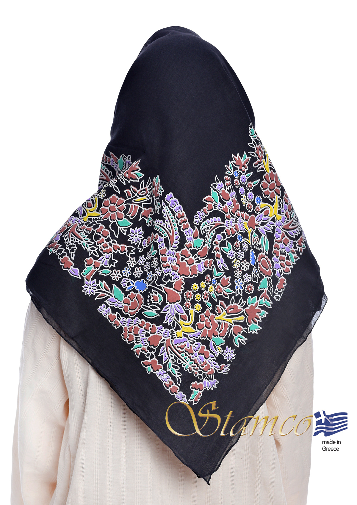 Παραδοσιακό Μαντήλι μαύρο βαμβακερό με τυπωμένα πολύχρωμα λουλούδια.