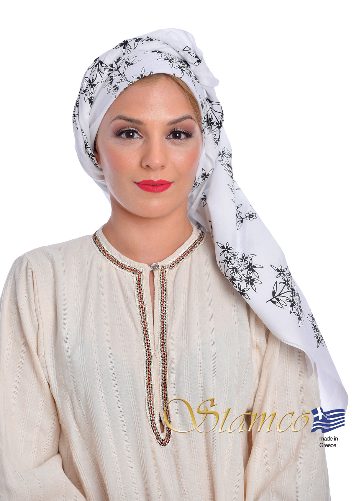 Παραδοσιακό Βαμβακερό Μαντήλι Λευκό με μαύρα τυπωμένα λουλούδια.